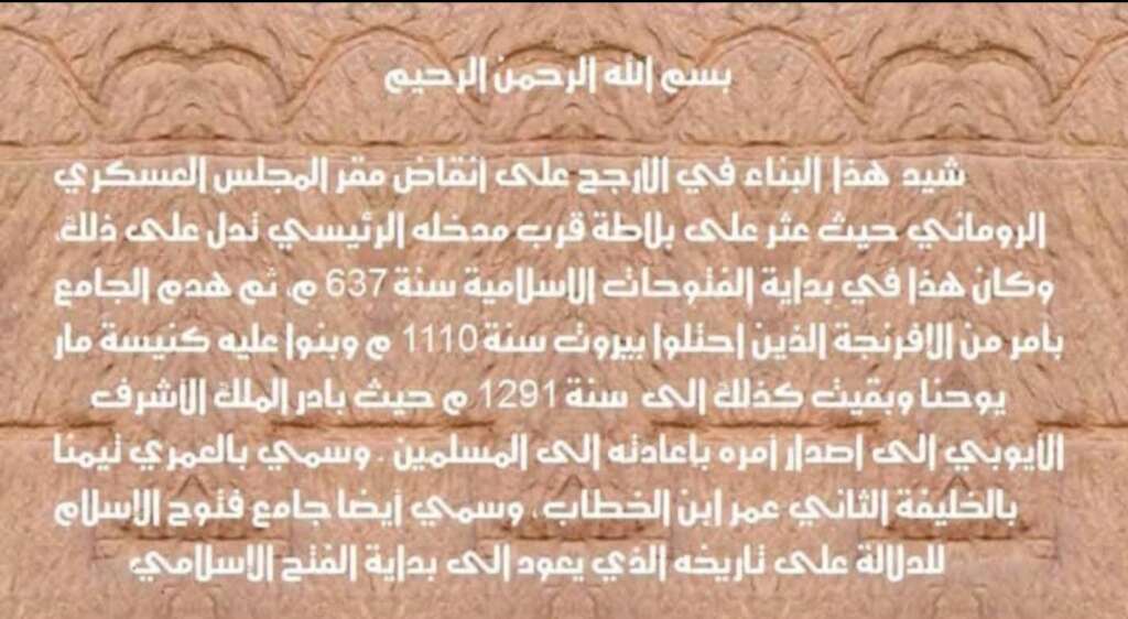 عندما دخلت الجيوش العربية سنة ٦٣٧ الى بيروت بنوا على انقاضه جامع الفتوحات ثم هدم في عهد الحروب الافرنجية سنة ١١١٠ وبني مكانه كنيسة مار يوحنا وبقي الأمر كذلك الى سنة ١٢٩١، ثم استردها الأيوبيون وحولوها الى مسجد وأطلقوا عليه المسجد العمري الكبير.